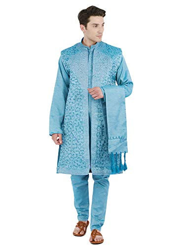 The SKAVIJ Men's Traditional Kurta Pajama with Jacket and Scarf is a high-quality, four-piece set made from art silk fabric. This set features a regular fit kurta with a mandarin neck and side slits for ease of movement. The drawstring allows for adjustable waistband fit, making it comfortable for various body sizes. The set includes a kurta, jacket, and scarf, perfect for weddings, parties, and other formal occasions. The intricate thread work embroidery adds elegance and charm to the overall design. This set is versatile and can be dressed up or down, making it suitable for both casual and formal events. The set is made from art silk fabric, which provides a comfortable and elegant look. The kurta has a mandarin neck, which adds to its traditional look. The side slits provide ease of movement, making it perfect for dancing and other activities. The drawstring closure allows for an adjustable fit, making it suitable for different body types. The set includes a kurta, jacket, and scarf, which can be worn together or separately. The kurta can be paired with pajamas or jeans for a casual look, or with a jacket and scarf for a more formal look. The set is available in different colors, including yellow, green, and turquoise. The SKAVIJ Men's Traditional Kurta Pajama Set with Jacket and Scarf is a must-have for any man who wants to look elegant and traditional. It is perfect for weddings, parties, and other formal events. The set is also suitable for everyday wear, providing a comfortable and stylish look.