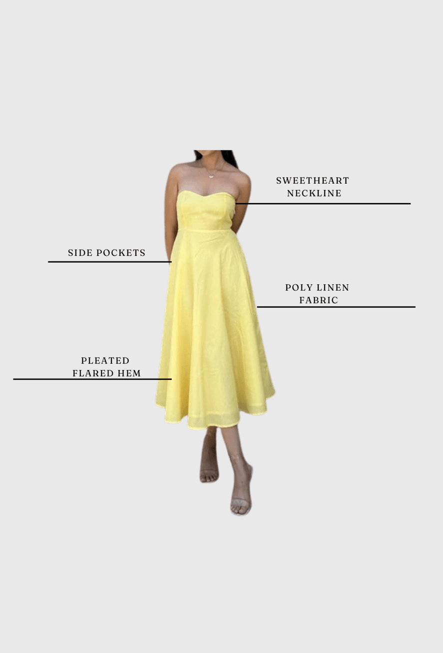 The Belle Tube Dress is a versatile addition to your warm-weather wardrobe. This charming yellow dress features a sweetheart tube dress neckline, side pockets, and a lace tie-up at the back to create a beautiful fit and flare midi dress silhouette. The dress is made of polyester linen and has a fitted bodice. It is an ideal vacation and birthday outfit. The dress has a machine wash care instruction. The model is wearing a size XS. The dress has a solid print and a woven fabric. It also has a lining made of 100% cotton. The dress is available in various sizes, including XS, S, M, L, and XL.