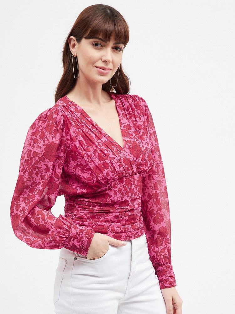 This Women's Pink Top is made of high-quality material and features a beautiful floral print. It has a regular fit with puff sleeves and is perfect for casual wear. The top is made of cotton and has a round neck with a V-back. It is available in various sizes.