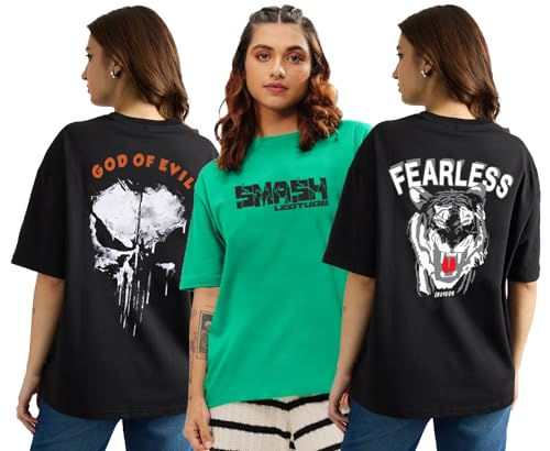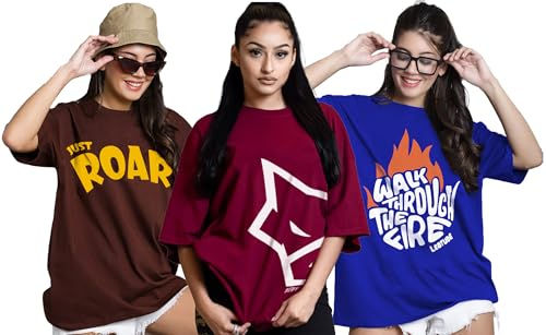 LEOTUDE Women's Combo T-Shirts Pack of 3 Oversized Cottonblend Half Sleeve Roun