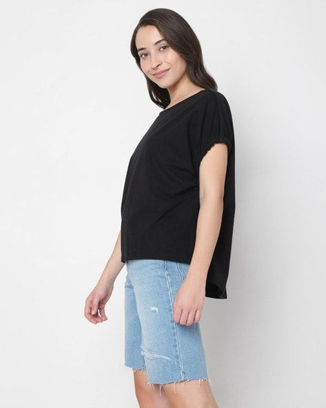 Elevate your wardrobe with this stylish boat neck T-shirt from Vero Moda. Featuring a drawstring sleeve design, this shirt is perfect for casual wear. Made from high-quality material, it provides a comfortable fit. Pair it with jeans or trousers for a chic look. The boat neck design adds a touch of elegance, while the drawstring sleeves provide a relaxed fit. The product is available in black color. Buy this trendy T-shirt online at Ajio.